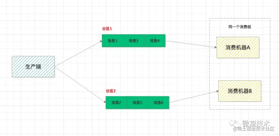 两台 MQ机器,组成一个集群,原先一个分区存储6条消息,现在分摊到两个分区,每个分区各存储3条消息,性能比上面那个提升一倍。