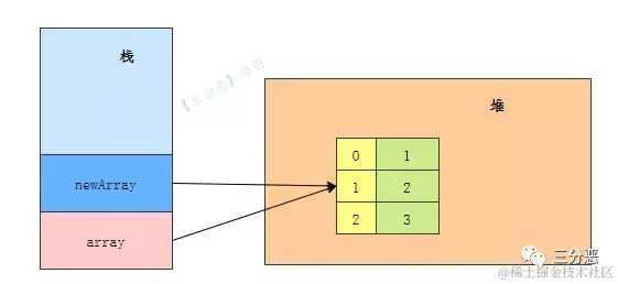 在Java中,数组是引用数组类型。array、newArray都是存储在栈中的引用,它们指向堆中真正存储的数组对象。