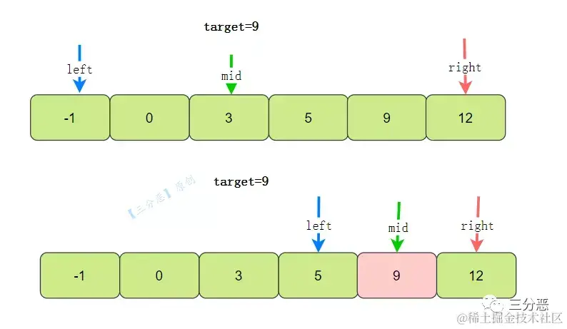 因为数组是有序的,所以定义三个指针,low、high、mid,每次与中间指针指向的元素nums[mid]比较,