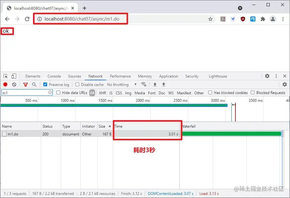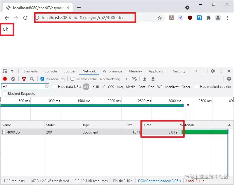 上面的 m2 方法个 timeout 参数,调用者通过这个参数来指定接口的超时时间,未超时的情况下,也就是说 timeout 大于 3 秒的时候,此时会输出 ok,否则将出现超时,此时会将 DeferredResult 构造器第 2 个参数的执行结果作为最终的响应结果,即会向客户端输出 timeout。