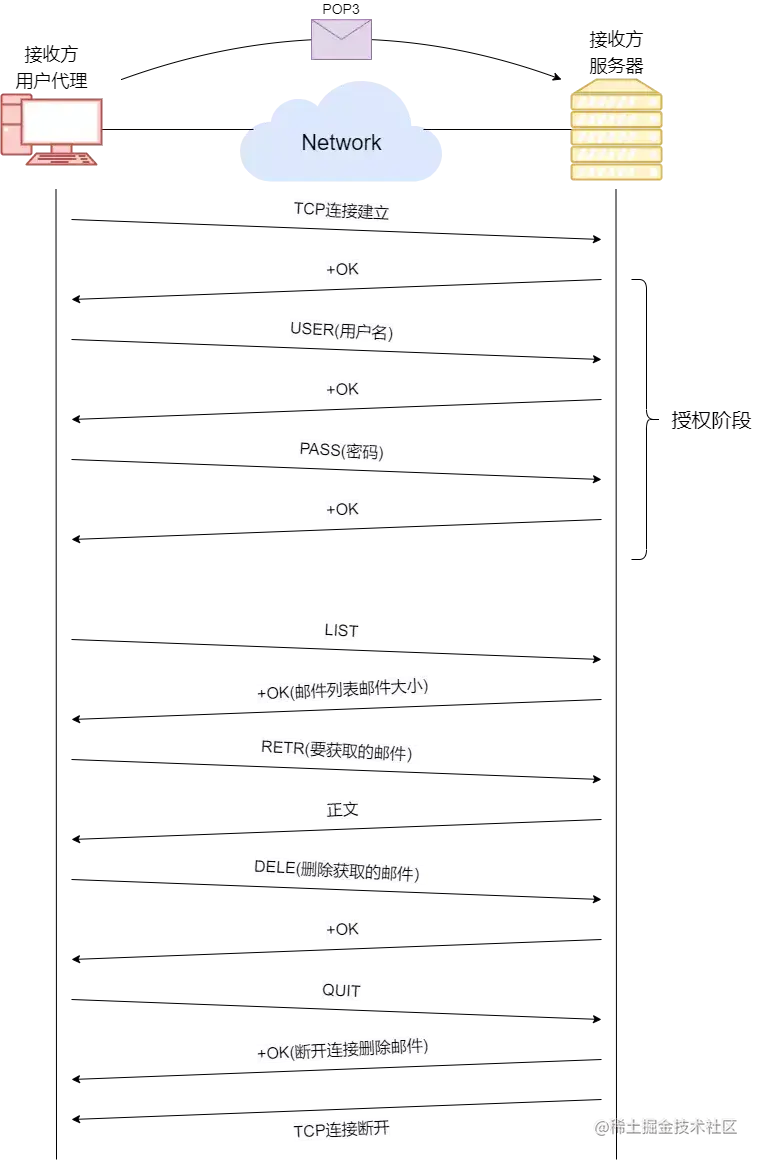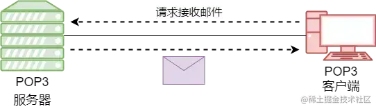 为了解决这个问题,就引入了 POP3 协议。POP3 协议是用于接收电子邮件的协议。发送端的邮件使用 SMTP 协议将电子邮件转发给一直在线的 POP3 服务器。客户端再根据 POP3 协议从 POP3 服务器接收邮件。这个过程中,为了防止别人盗取邮件内容,还要进行用户认证。