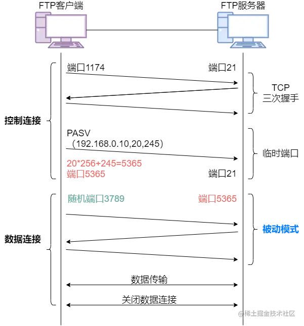 被动方式也被称为 PASV 方式。FTP 控制通道建立后,希望通过被动方式建立数据传输通道的 FTP 客户端会利用控制通道向 FTP 服务器发送 PASV 命令,告诉服务器进入被动方式传输。服务器选择临时端口号并告知客户端,命令参数和主动传输方式一致。当需要传输数据时,客户端主动与服务器的临时端口建立数据传输通道,并完成数据传输。在整个过程中,服务器是被动接收客户端的数据连接,所以被称为被动模式。