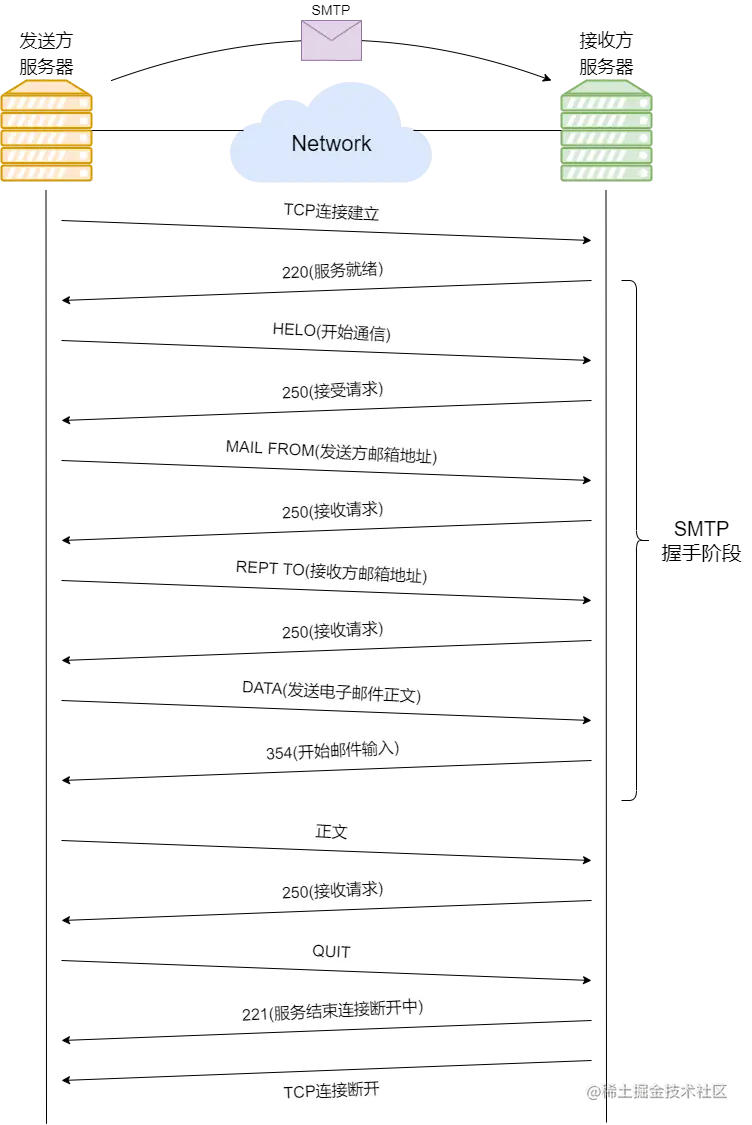 SMTP 为了实现高效发送邮件内容,在传输层使用了 TCP 协议,端口号是 25。在一台邮件服务器向另一台邮件服务器发送邮件时,首先向对方的 TCP 25 端口发起一条连接。然后利用这条 TCP 连接发送控制消息和数据。