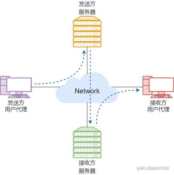 电子邮件在几十年的发展过程中出现了明显的变化,从原始的发送方电脑直接向接收方电脑发送电子邮件,演变成收发双方都使用邮件服务器代为收发邮件。通过这种方式,电子邮件通信不再依赖接收方当前是否在线,而电子邮件的通信过程由简单的发送方到接收方,演变成发送方电脑到发送方邮件服务器,发送方邮件服务器到接收方邮件服务器,以及接收方邮件服务器到接收方电脑的三个通信过程。并且参与通信的四方都不是直接相连,而是分别独立连接到互联网中。这个架构中,邮件发送方和接收方使用的电脑称为用户代理。