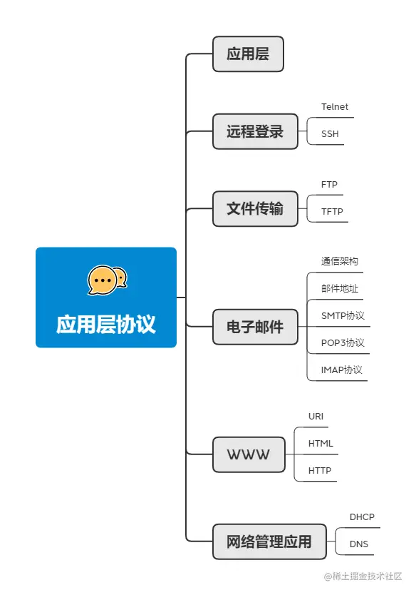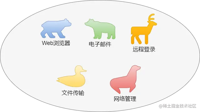 应用程序有很多,包括 Web 浏览器、电子邮件、远程登录、文件传输、网络管理等。这些应用程序都会使用应用协议进行通信,应用协议正是为了实现应用程序的功能而设计和创造的。