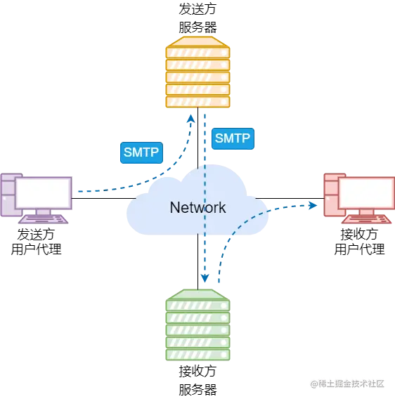 提供电子邮件服务的协议叫做 SMTP 。SMTP 用于收发双方的邮件服务器之间,而不是用户代理和邮件服务器之间的通信方式。在实际使用中,发送方用户代理与发送方服务器之间也常采用 SMTP 协议。