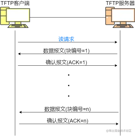 TFTP 进行文件传输时,将传输文件看成是由多个连续的文件块组成。每一个 TFTP 数据报文中包含一个文件块,同时对应一个文件块编号。每次发完一个文件块后,就等待对方的确认,确认时指明块编号。发送方发完数据后,如果在规定时间内没收到对端的确认,那么发送方就会重新发送数据。发送确认的一方如果在规定时间内没收到下一个文件块数据,则重发确认报文。这种方式可以确保文件的传送不会因某一个数据的丢失而失败。