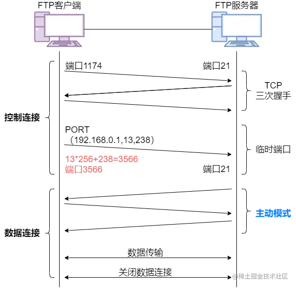 FTP 主动传输方式,也称为 PORT 方式。采用主动方式建立数据连接时,FTP 客户端会通过 FTP 控制连接向 FTP 服务器发送 PORT 命令,PORT 命令携带参数:A1 、A2 、A3 、A4 、P1 、P2 ,其中 A1 、A2 、A3 、A4 表示需要建立数据连接的主机 IP 地址,而 P1 和 P2 表示客户端用于传输数据的临时端口号,临时端口号的数值为 256*P1+P2 。当需要传输数据时,服务器通过 TCP 端口号 20 与客户端提供的临时端口建立数据传输通道,完成数据传输。在整个过程中,由于服务器在建立数据连接时主动发起连接,因此被称为主动模式。