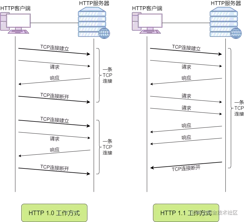 HTTP 中常用的有两个版本,一个是 HTTP 1.0 ,另一个是 HTTP 1.1 。在HTTP 1.0 中每一个命令和应答都会触发一次 TCP 连接的建立和断开。而从 HTTP 1.1 开始,允许在一个 TCP 连接上发送多个命令和应答,这种方式也叫保持连接( keep-alive )。可以大量减少 TCP 连接的建立和断开操作,提高传输效率。