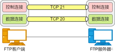 FTP 使用两条 TCP 连接实现文件传输。一条是 FTP 控制连接,用来控制管理;另一条是 FTP 数据连接,用于数据传输。FTP 控制连接用于传输 FTP 控制命令和命令执行的应答信息,比如登录用户名和密码的验证、发送文件的名称、发送方式的设置。这条连接在整个 FTP 会话过程中一直保持打开,通过 ASCII 码字符串发送请求和接收应答。在控制连接上无法发送数据,而 FTP 数据连接用于文件和文件列表的传输,仅在需要传输数据时建立数据连接,数据传输完毕后终止。