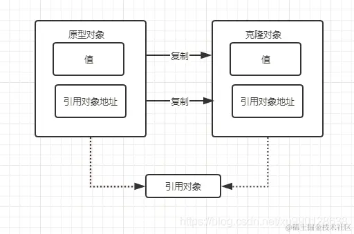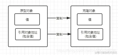 把原型对象中成员变量为引用类型的引用地址也复制给克隆对象, 即 原型对象汇总如果有成员变量为引用对象,则此引用对象的地址是共享给原型对象的和克隆对象的