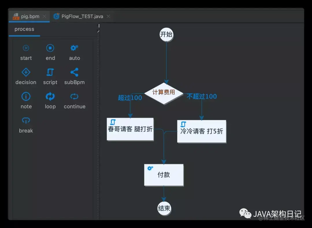 - 完善的插件支持:流程设计目前有 IntelliJ IDEA、Eclipse 插件支持,可以在流程设计中实时动态生成 java 代码并预览,所见即所得。