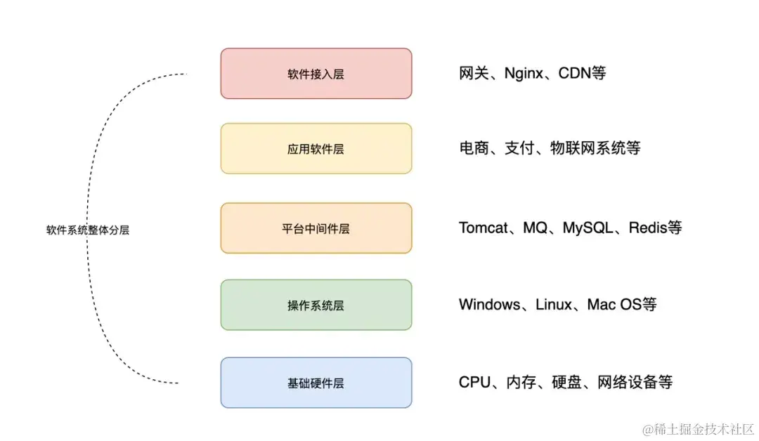 以Java软件应用为例,整个软件系统也可进行分层,比如分为部署的硬件环境、操作系统、所需的中间件、承载业务的应用程序以及软件接入层。可通过下图进行整体了解: