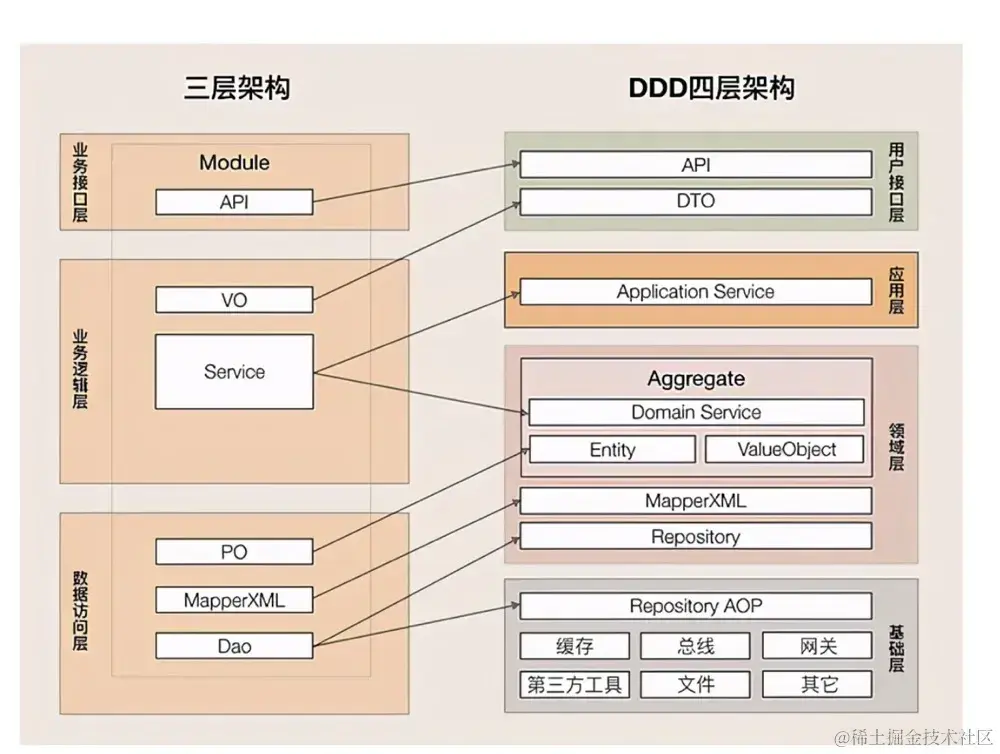 DDD四层架构也基于传统三层架构的,看一下它们之间的对照关系: