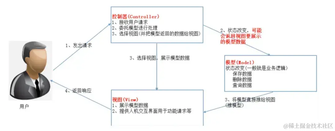 从图中可以看到,标准的MVC中模型能主动推数据给视图进行更新(观察者设计模式,在模型上注册视图,当模型更新时自动更新视图),但在Web开发中模型是无法主动推给视图(无法主动更新用户界面),因为在Web开发是请求-响应模型。