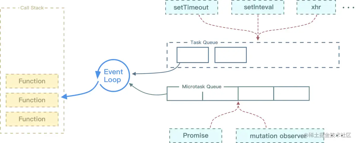 | 具体事件 | 1. script (可以理解为外层同步代码) 2. setTimeout/setInterval 3. UI rendering/UI事件 4. postMessage,MessageChannel 5. setImmediate,I/O(Node.js) | 1. Promise 2. MutaionObserver 3. Object.observe(已废弃;Proxy对象替代) 4. process.nextTick(Node.js) |