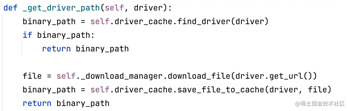 通过上面的分析知道这个方法是用来获取浏览器驱动地址的,先判断缓存中是否已经存在想要的驱动,已经存在就直接返回,没有的话,就要去下载驱动,然后保存到缓存中。这个缓存其实是保存在本地的一个文件,以{os_type}_{driver_name}_{driver_version}_{browser_version}来区分。