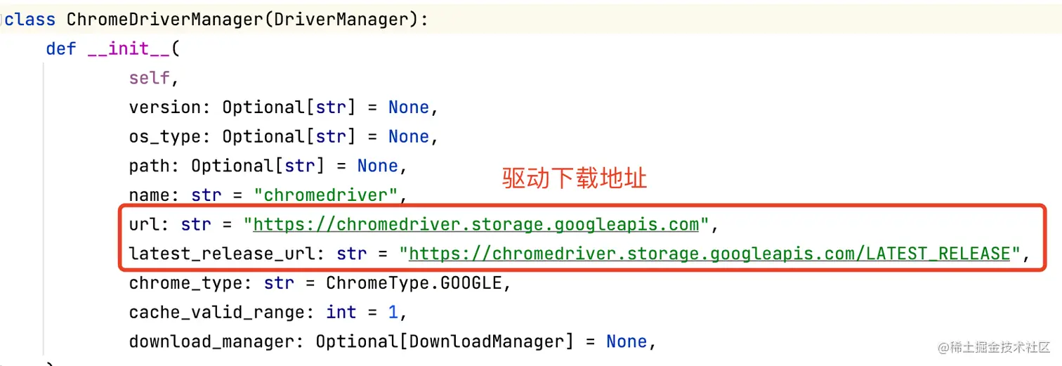 ChromeDriverManager构造方法很简单,在这里可以看到chrome驱动的下载地址,后续对应版本的驱动就是使用这个下载地址拼接版本号进行下载的。
