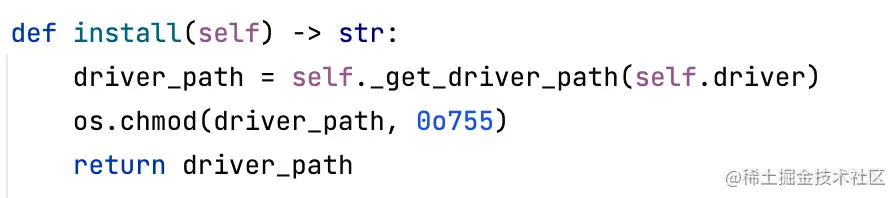install方法也很简单,主要是获取浏览器驱动的地址,通过命令chmod 755 /path/to/driver将浏览器驱动设置为可执行文件,然后返回,也就是我们之前手动设置浏览器可执行文件的步骤。