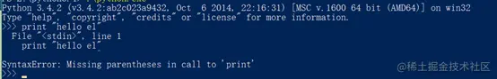(PS:本来这个错误不应该特别强调不然反而会让初学者懵逼,但是考虑到现在Python 2.x 代码仍然很多,为了避免初学者使用3.x 的解释器去运行2.x的代码导致出错,我还是单独把这个错误提出来讲一下)