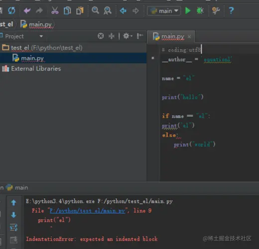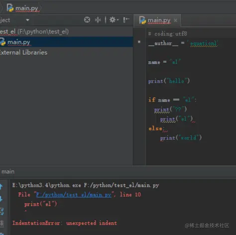 上述代码我们想实现的是如果名字等于 el 就输出 el ,否则输出 world ,但是我们却在第一个 if 下面忘记加上空格,这样 if 就无法区分究竟哪一行代码属于它管辖,从而造成缩进错误。