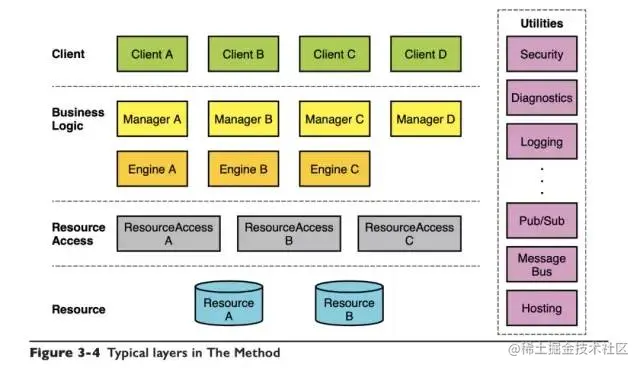 从上往下,易变性是逐渐降低的,这个我们可以理解,公司里最常修改的都是上面的一些业务逻辑,底层的基础设施几年变一次就不错了。