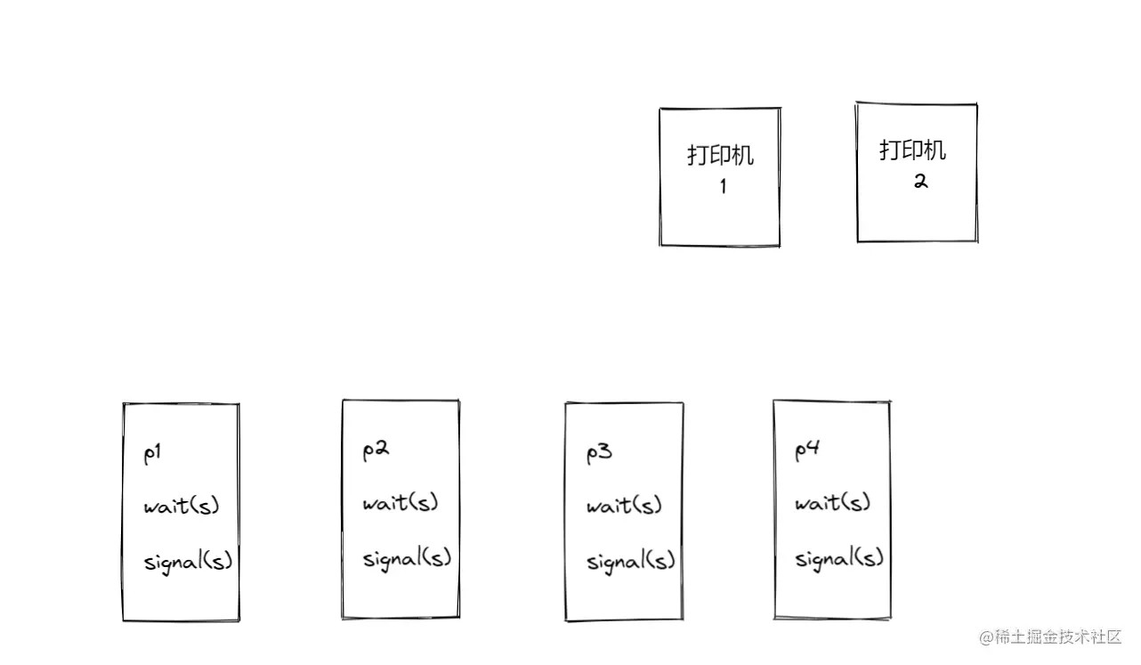 假设有四个进程p1~p4,他们都要使用打印机,也就是说打印机就是这四个进程的临界资源,我们假设有两台打印机。