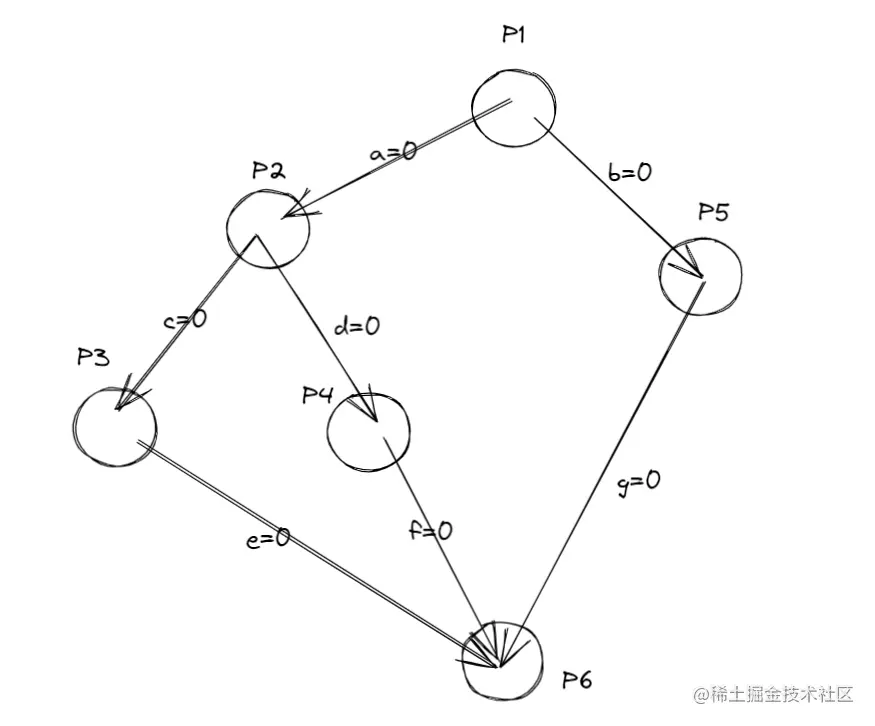 那么知道什么是前驱关系后,该如何实现它呢?我们的解决方案是为每一对前驱关系都设置一个同步变量,初值都为0。