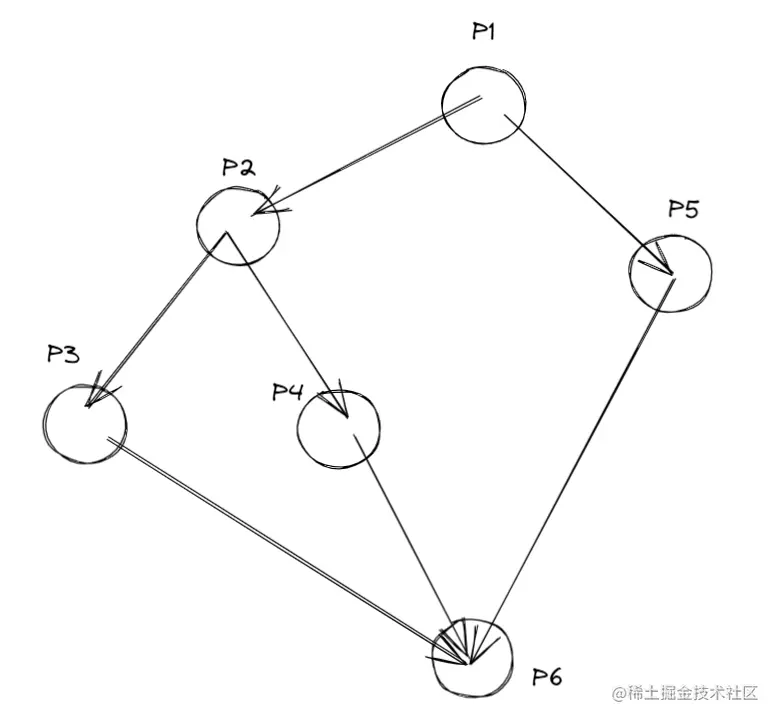 假设有6个进程P1~P6,执行顺序的关系如图所示:执行P1后才能执行P2,P5,执行完P2后才能执行P3和P4。