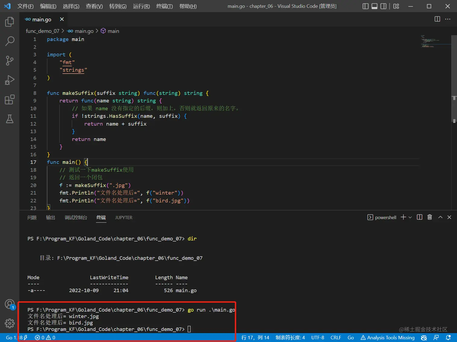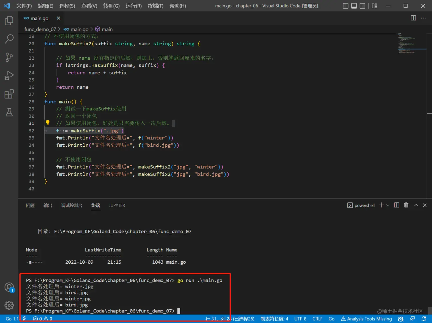 makeSuffix(suffix string)可以接收一个文件后缀名(比如.jpg),并返回一个闭包。 - 调用闭包,可以传入一个文件名,如果该文件名没有指定的后缀(比如.jpg),则返回文件名.jpg,如果已经有.jpg后缀,则返回原文件名。