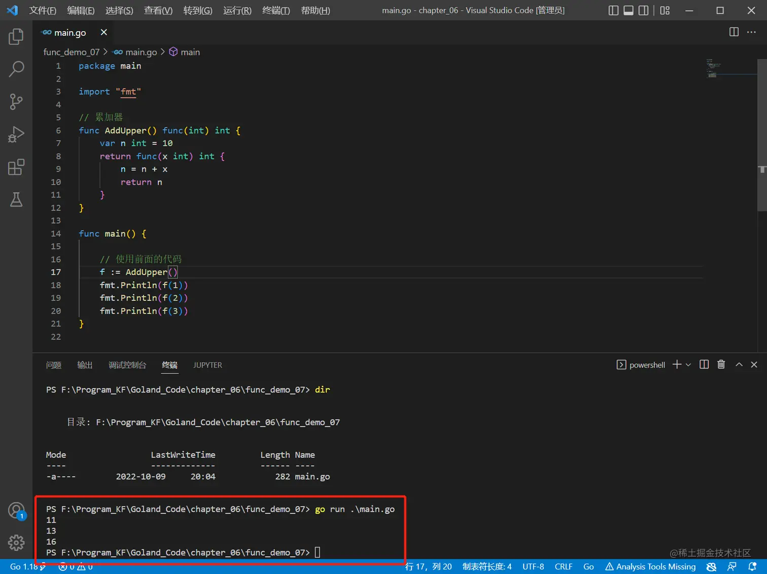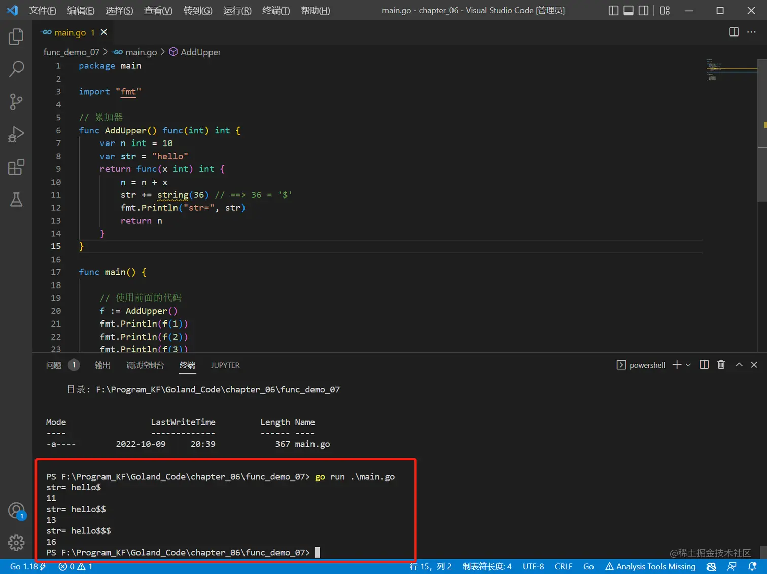 - AddUpper() ,是一个函数,返回的数据类型是 func (int) int