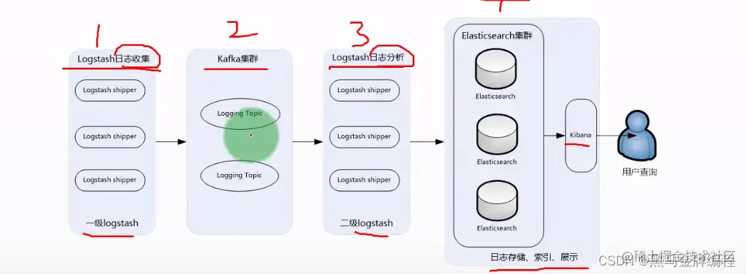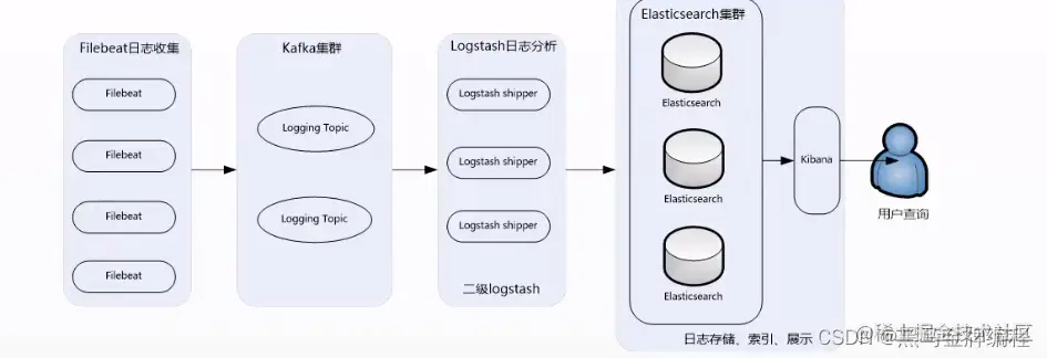 一般都是在需要收集日志的所有服务器上部署logstash,作为logstash中的shipper用于监控并收集、过滤日志,接着,将过滤后的日志发送给Broker,然后,Logstash 中的 Indexer将存放在Broker 中的数据在写入Elasticsearch,Elasticsearch对这些数据创建索引,最后由Kibana对其进行各种分析并以图表的形式展示。