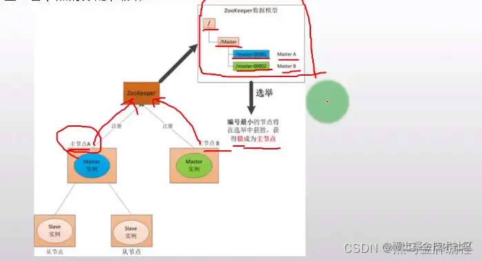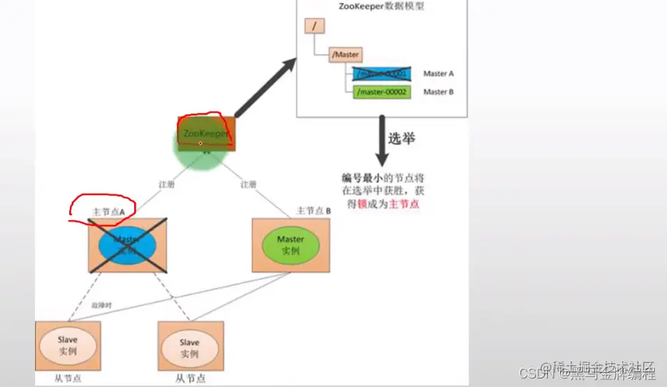 当主节点发生故障,它所在Zookeeper所注册的节点信息会被自动删除,,Zookeeper会自动感知节点的变化、发现主节点故障后会再次发出选举,直到选举出新的主节点。