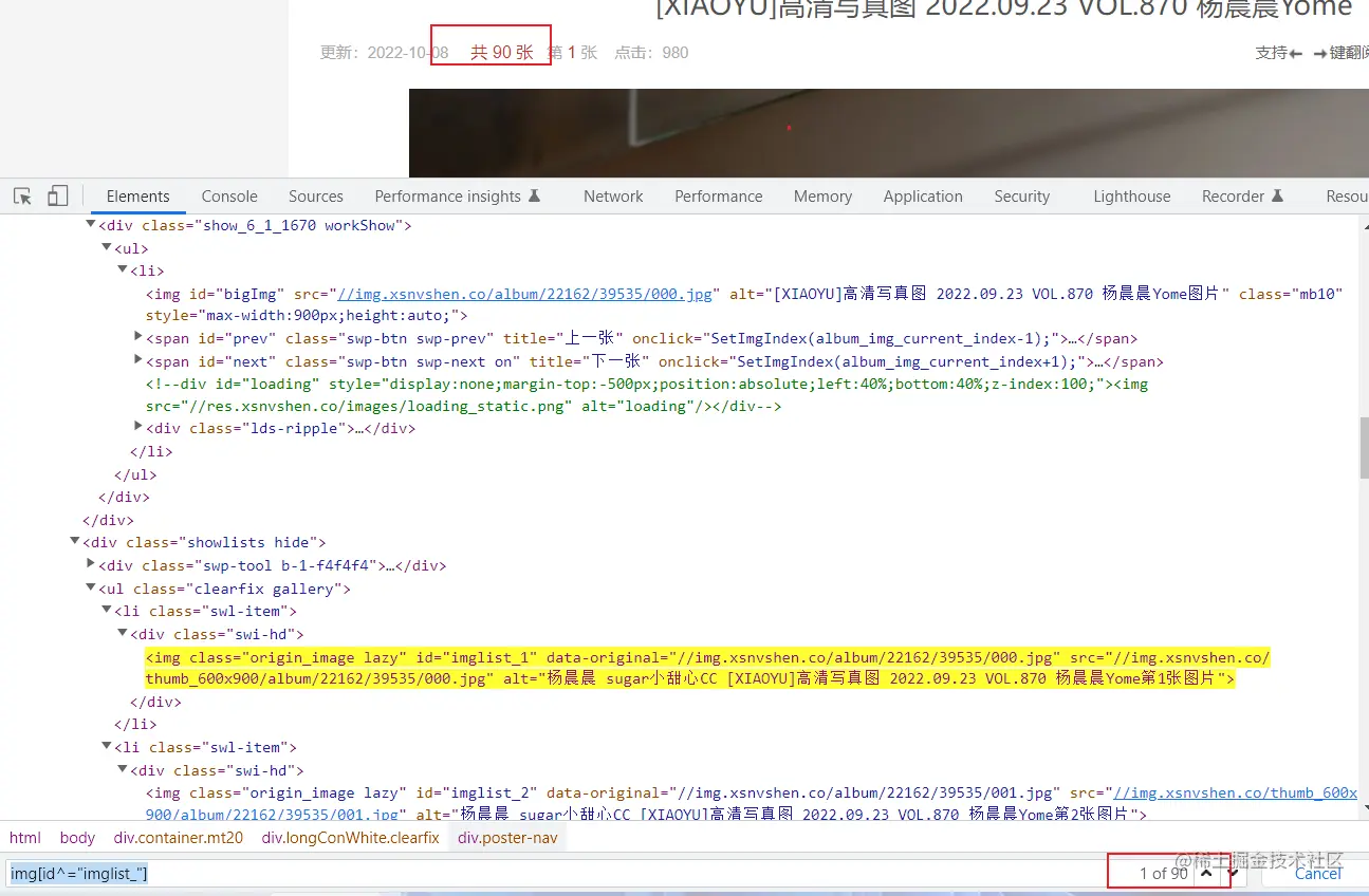 正文,也就是图集:图集是可以支持列表模式及左右翻页的,而且在切换展示形式和左右翻页的时候是没有发生新的网络请求,所以我们断定,图集中的所有图片都存在当前网页中,我们去找一找。找完了,发现图片的元素位置是这里,可以img标签里面元素很多,可以根据class去找,也可以根据父子级关系去找,但这里我们使用id去找,虽然id是不同的,但却都包含imglist_这个字符串,我们就可以根据这个特征去查找: