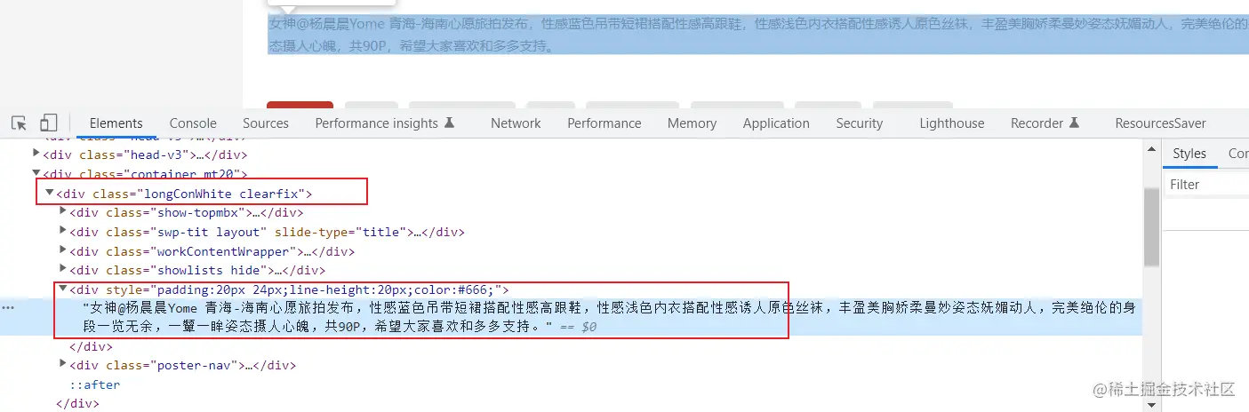 描述:可以看到描述所在的元素位置的div上面的属性的没有规律的,只有一个style,没有class及id等明显标识符,这时我们就要看它的上一级有没有什么明显的标志。我们发现上一级存在一个class,本div存在style属性,所以就可以根据这个条件生成css选择器: