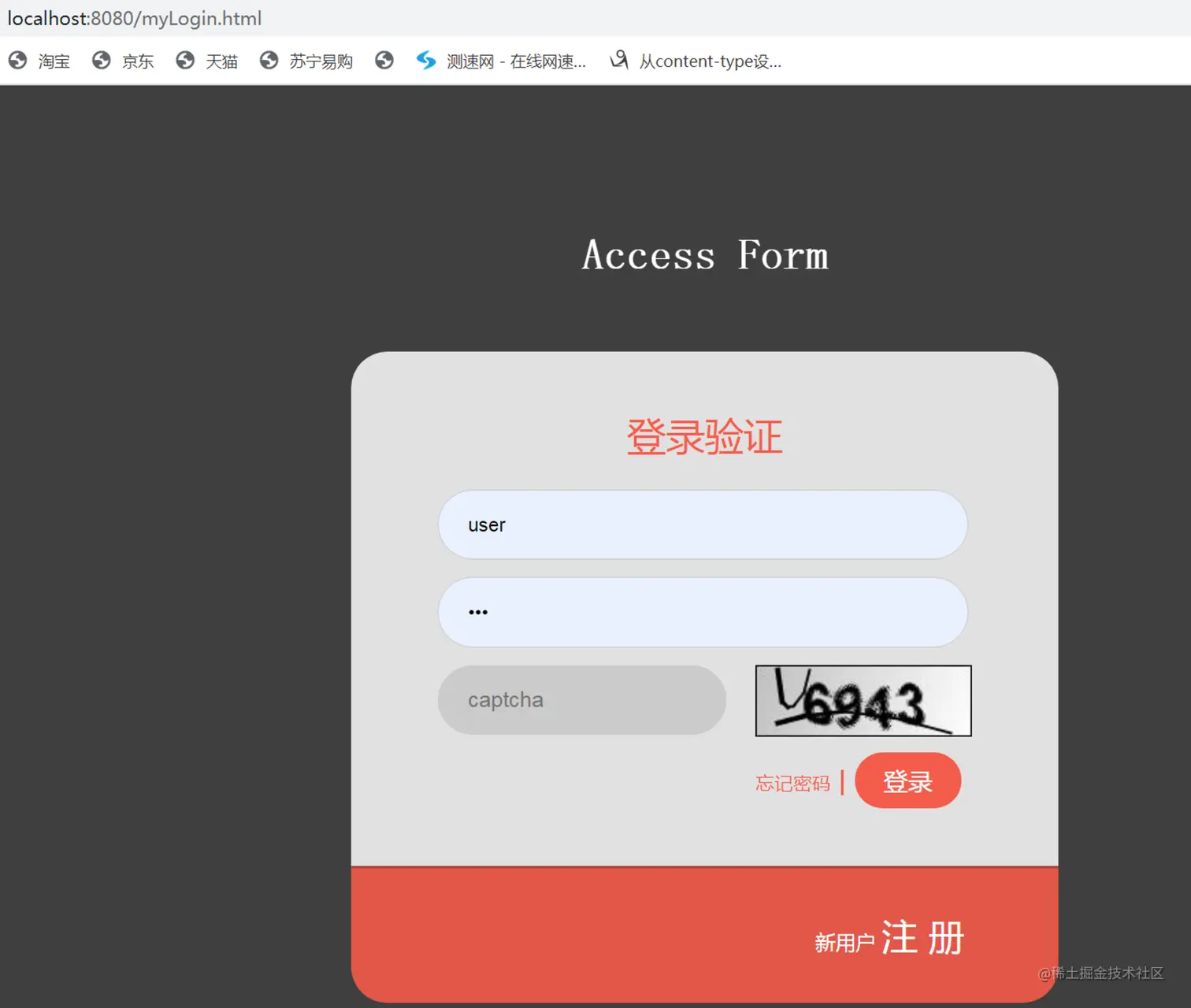 接下来我们启动项目,在访问受限接口时,会重定向到myLogin.html登录页面,可以看到我们的验证码效果已经显示出来了。