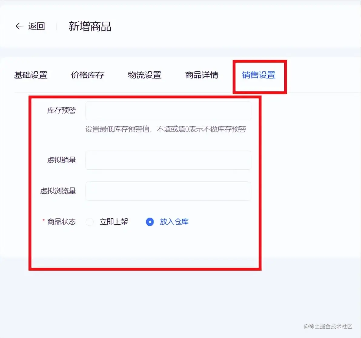 销售设置:库存预警、虚拟销量、虚拟浏览量、商品状态,如下图所示: