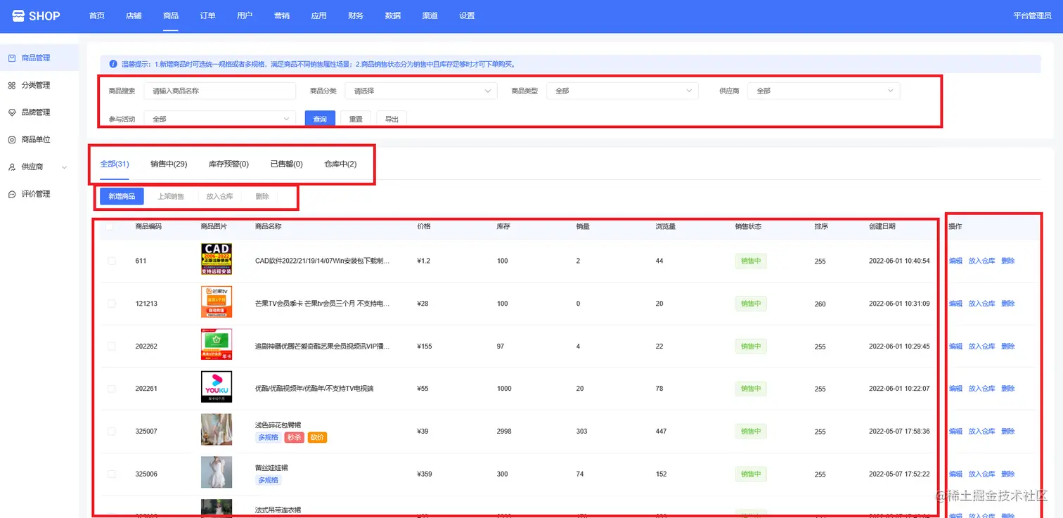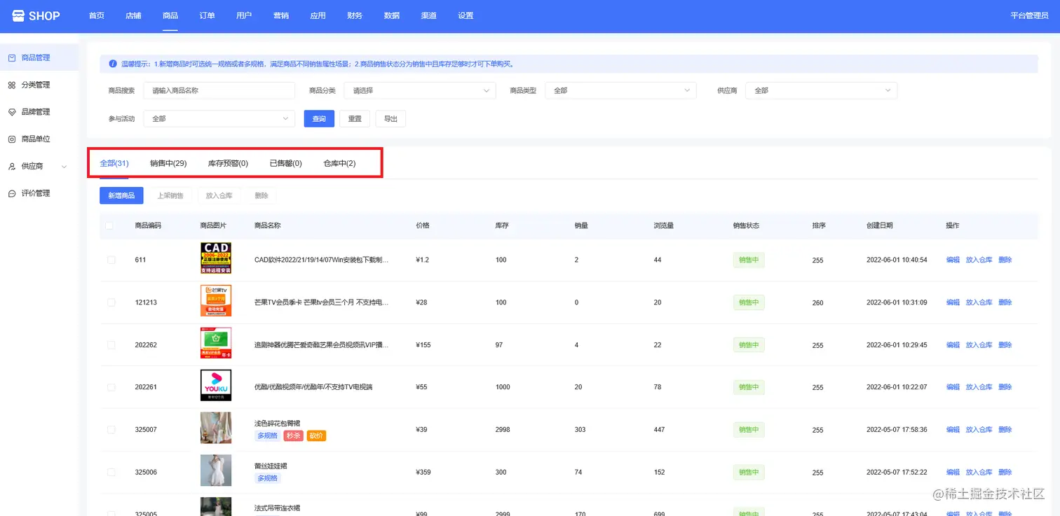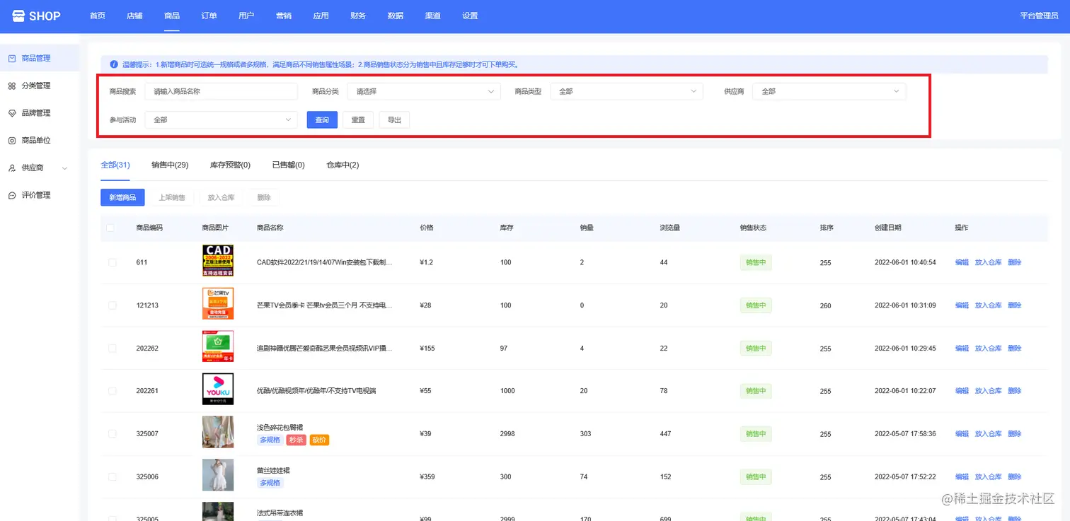 平台管理员可以通过输入商品名称、选择商品分类、商品类型、供应商、参与活动等搜索商品,如下图所示: