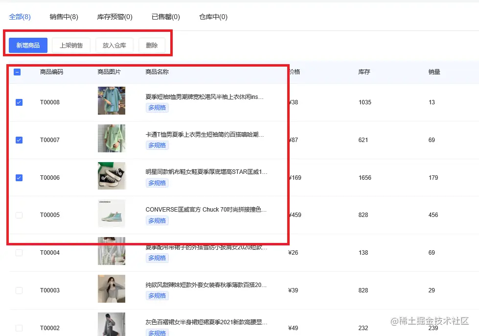 商品管理包括全部、销售中、库存预警、已告罄、仓库中,如下图所示: