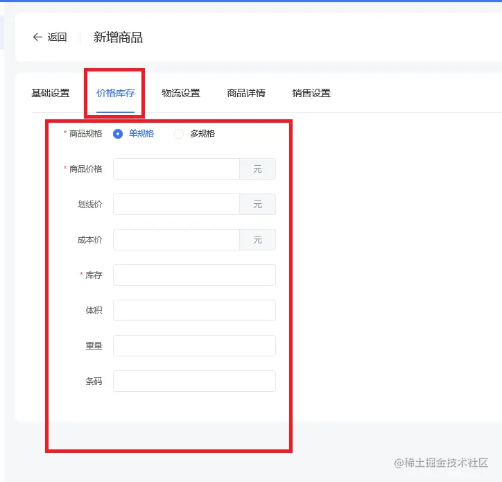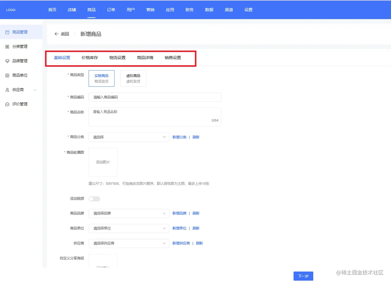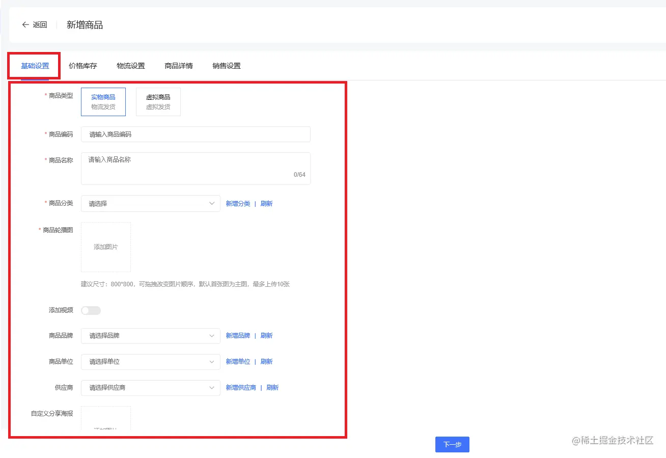 新增商品,需要填写基础设置、价格库存、物流设置、商品详情、销售设置等设置,如下图所示: