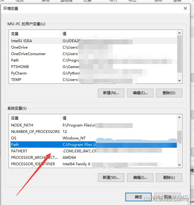 step3:选择环境变量,后进入以下界面,在系统变量框中,找到 path ,点击 编辑: