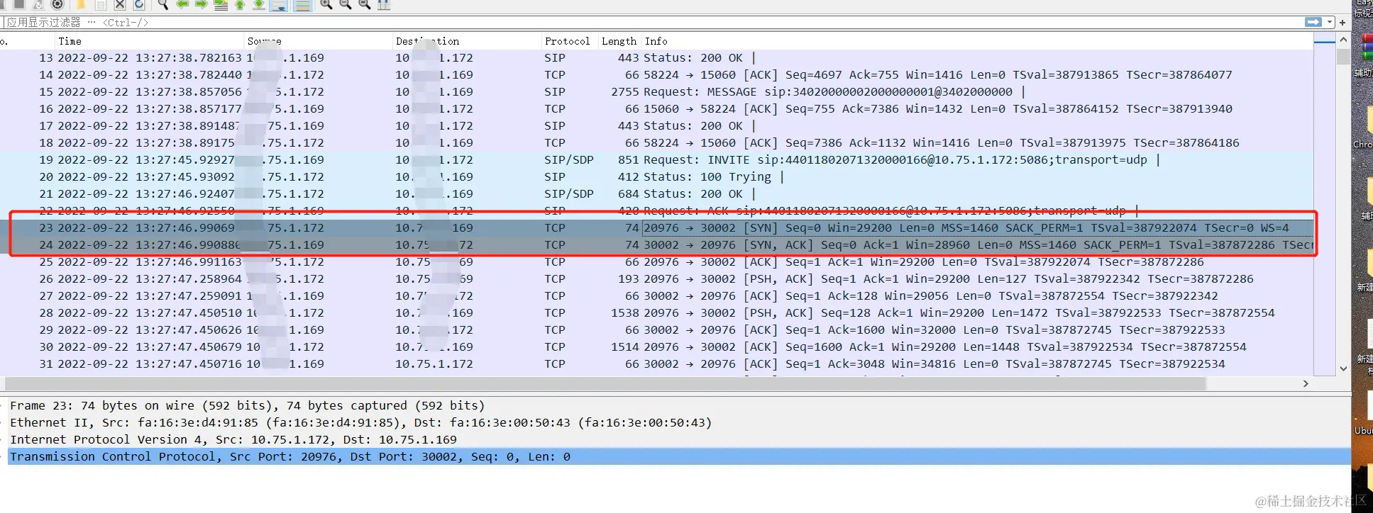 从数据包中查看平台发送invite请求播放录像消息,设备这边回复200ok的请求流程是正常的,但是请求之后可以看到设备没有发流。随后从数据包里分析,正常请求播放视频之后,平台发送了syn的交互信息,应该是设备主动发送的。