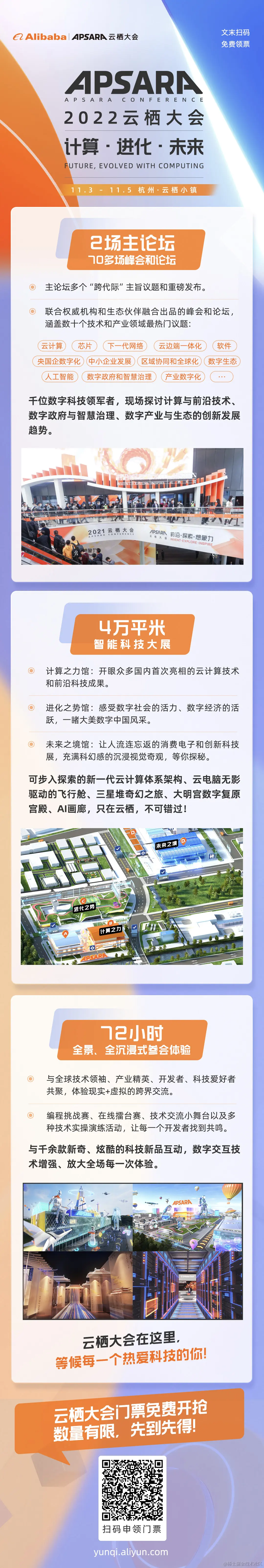 2022 云栖大会将于 11 月 3 日-11 月 5 日举行,今年云栖大会以“计算·进化·未来”为主题,在 3 天内设置两场主论坛,70 多场数字技术、产业和生态分论坛,以及 4 万平米智能科技全景展览。