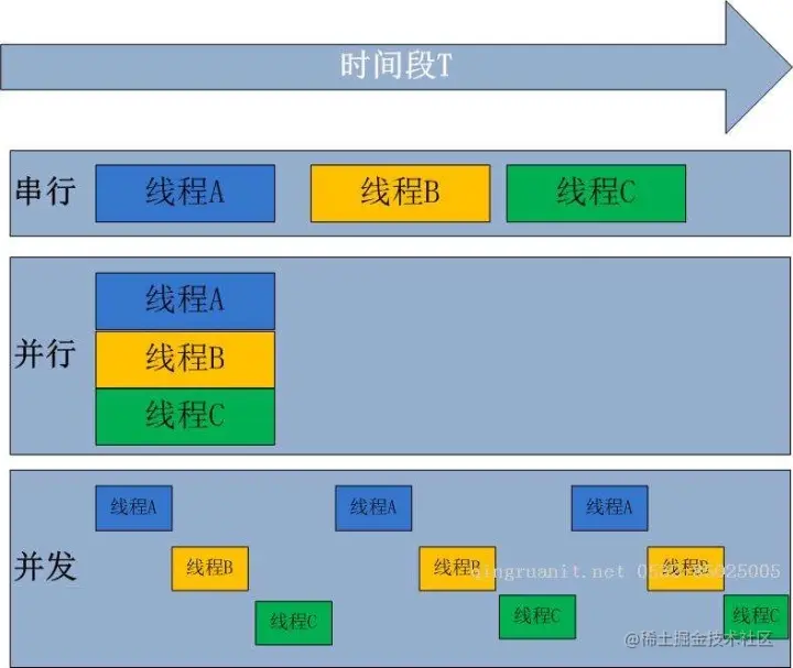 下图为CPU时间片段对于串行、并行、并发的线程处理的区别。
