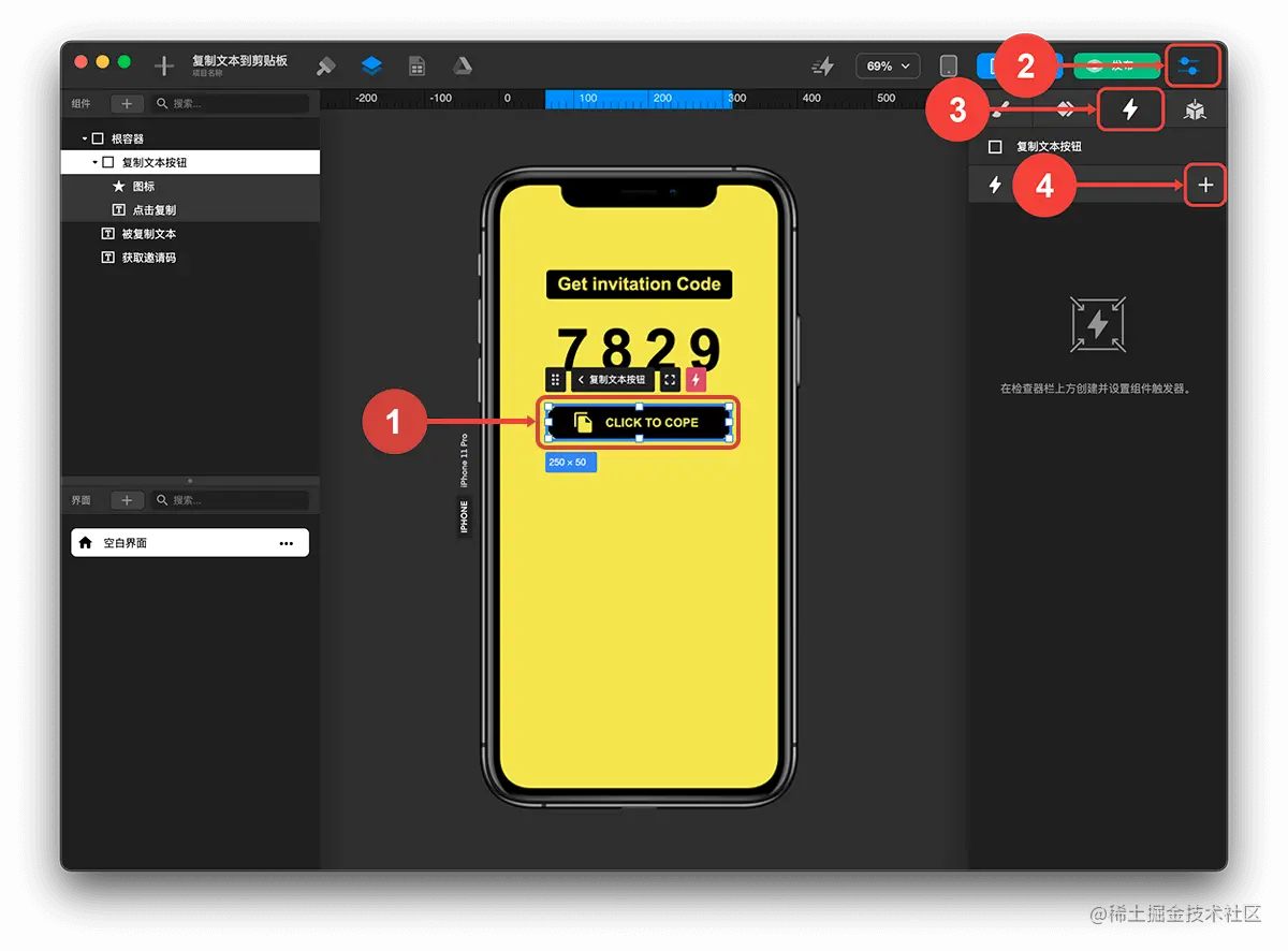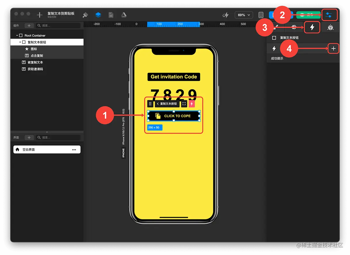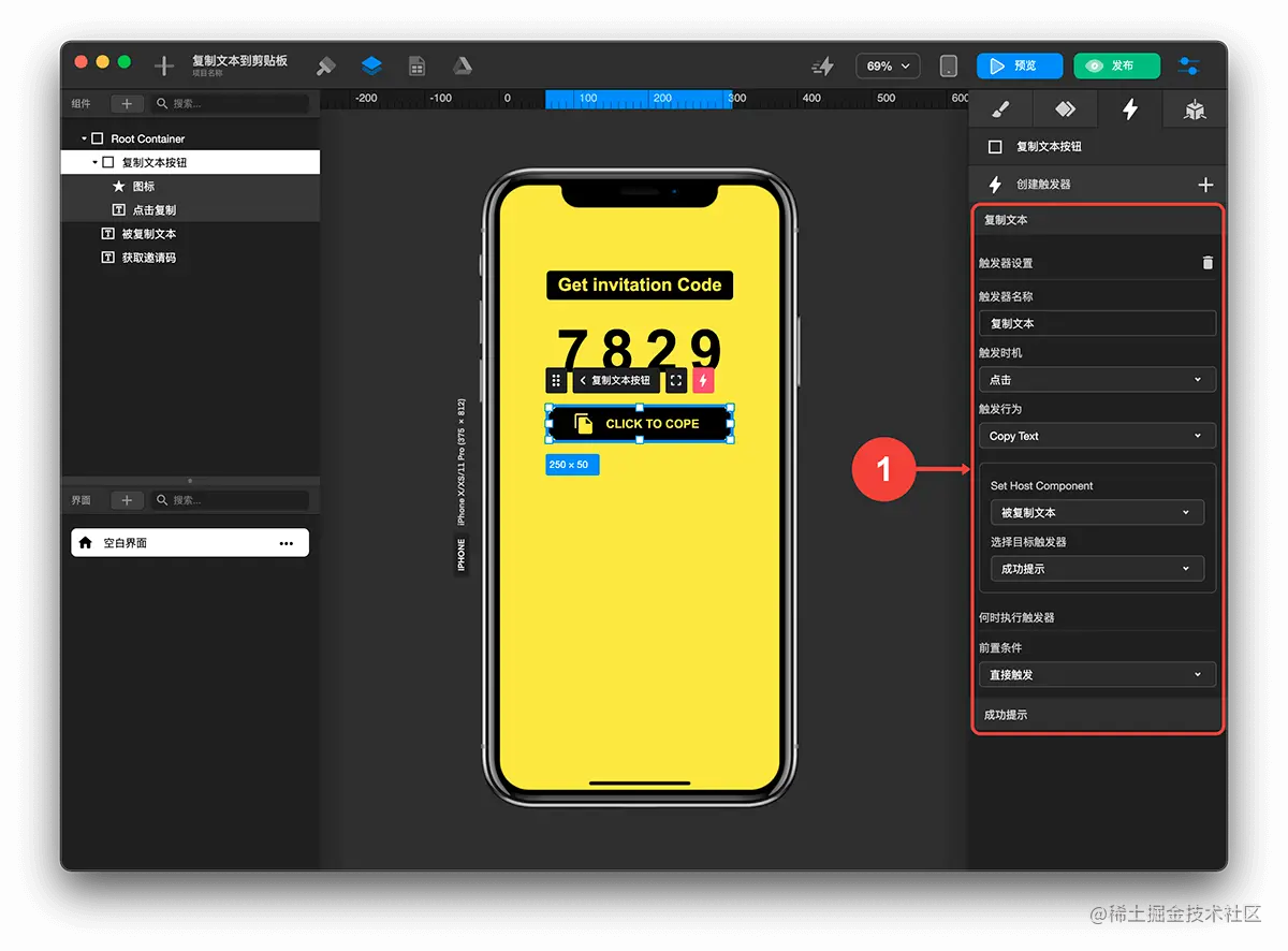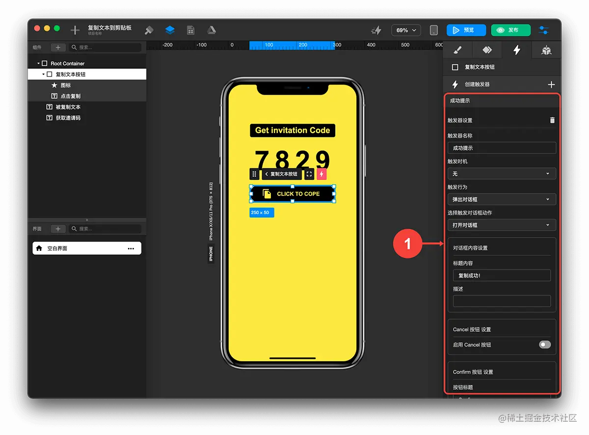 如何实现复制文本到剪贴板? TOWIFY 2022-10-10 181 阅读1分钟 效果展示: 前置准备: 添加触发复制的按钮 添加被复制的文本 步骤分解: 创建成功提示触发器 选中复制文本按钮 点击检查器标签 点击触发器标签 创建触发器 配置成功提示触发器 触发时机-无 触发行为-弹出对话框 选择触发对话框动作-打开对话框 标题内容-复制成功! 创建复制文本触发器 选中复制文本按钮 点击检查器标签 点击触发器标签 创建触发器 配置复制文本触发器 触发时机-点击 触发行为-复制文本 选择组件-被复制文本 标题目标触发器-成功提示 这样就可以实现复制文本到剪贴板了。