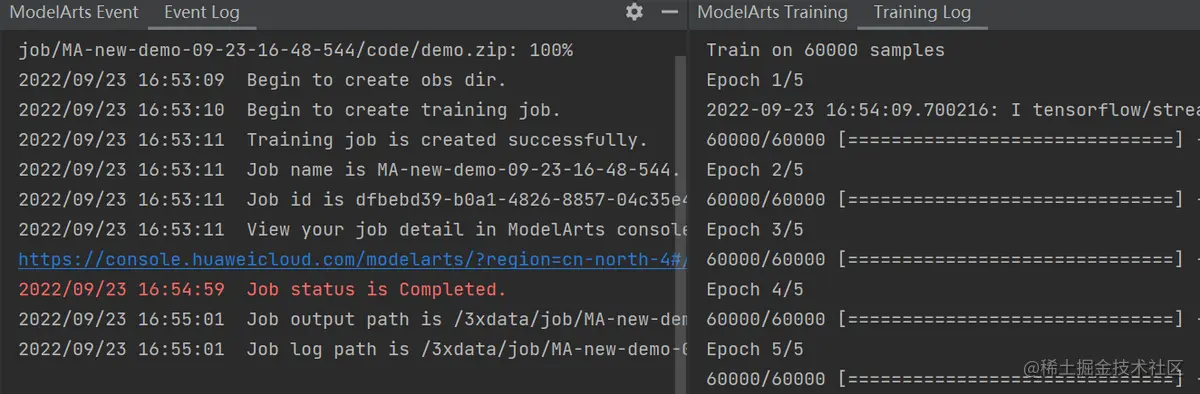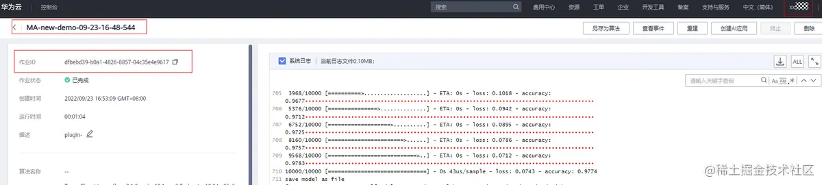 填写无误后,点击Apply and Run, 等待训练作业运行完成即可看到如下图日志输出