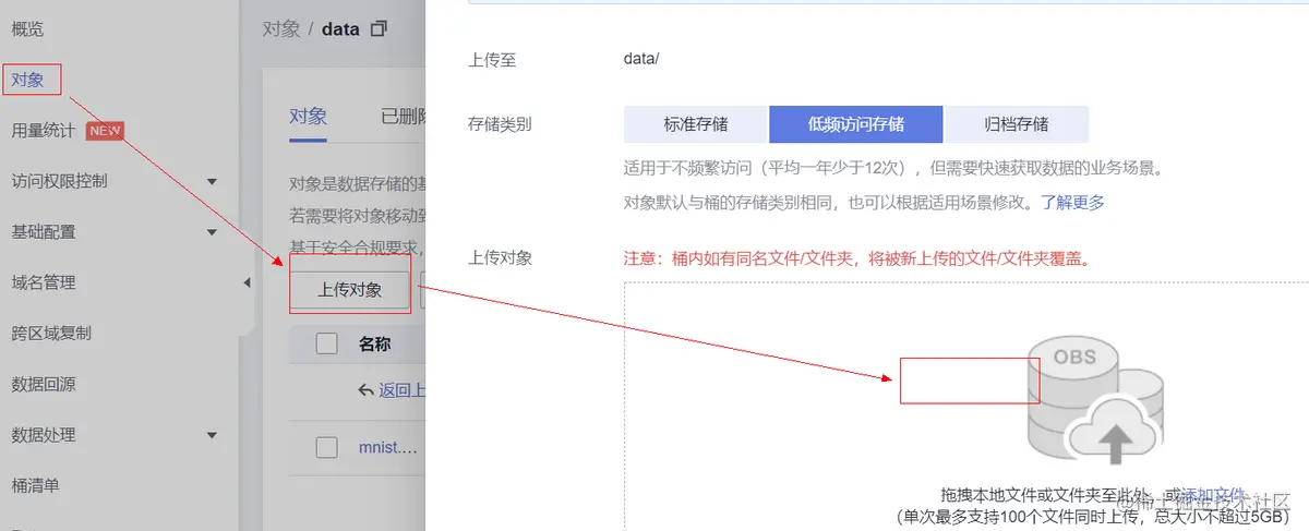 进入到OBS控制台中,如果没有OBS桶,需要创建一个,如果已有桶,在该桶下新建一个data文件夹,把已下载好的训练数据上传至该OBS文件夹中。