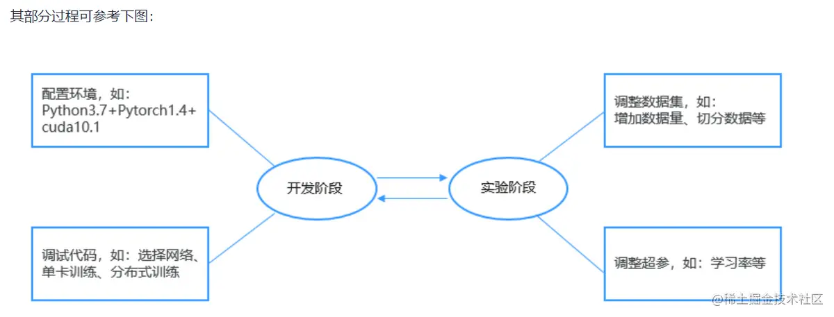 两个过程可以相互转换。如开发阶段代码稳定后,则会进入实验阶段,通过不断尝试调整超参来迭代模型;或在实验阶段,有一个可以优化训练的性能的想法,则会回到开发阶段,重新优化代码