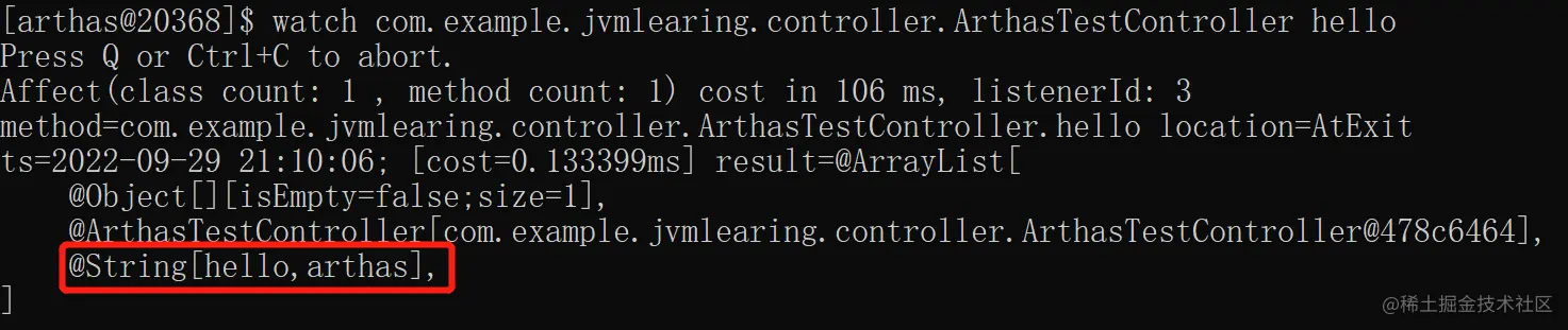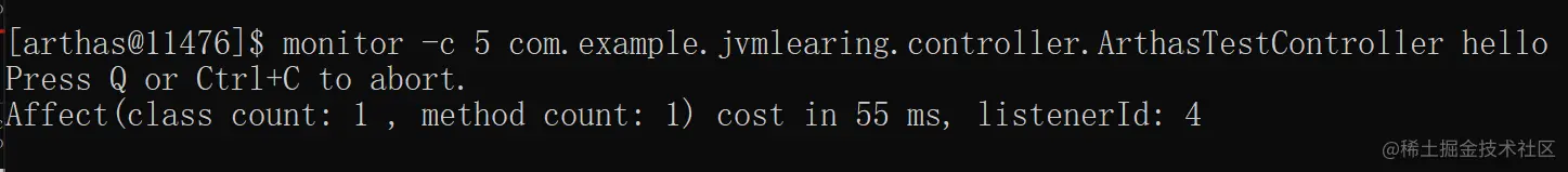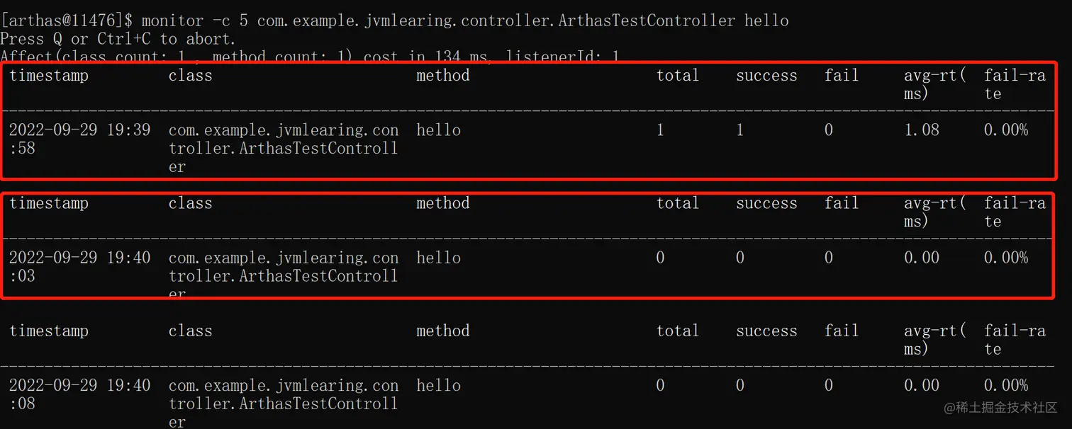 monitor可以对方法执行监控。比如下面一段命令 monitor -c 5 com.example.jvmlearing.controller.ArthasTestController hello,每隔5秒钟对ArthasTestController#hello方法进行一次监控。