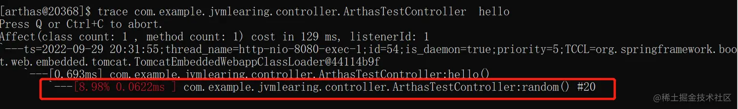 使用 trace 命令可以跟踪统计方法耗时。比如使用命令trace com.example.jvmlearing.controller.ArthasTestController hello统计ArthasTestController#hello方法耗时。